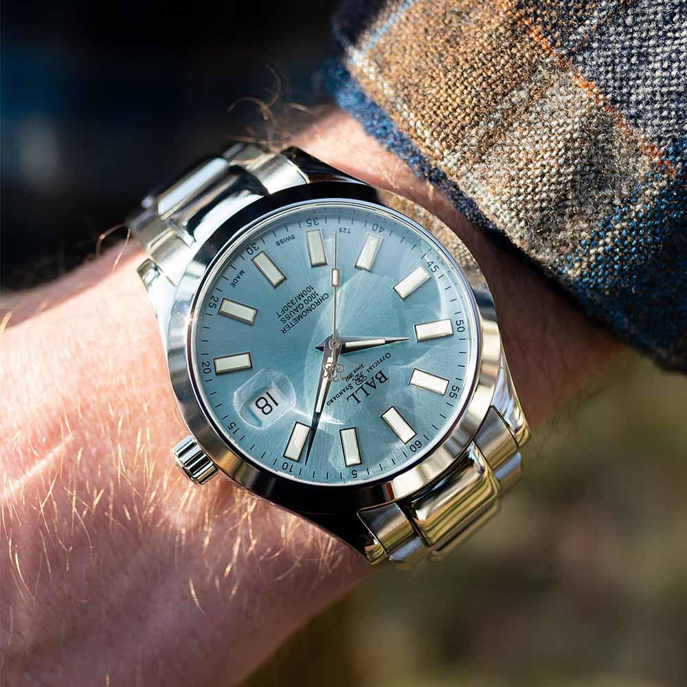 Blue stainless steel case with a black rubber strap. Blue bezel. Blue dial with silver-tone hands and index hour markers. Minute markers around the outer rim. Dial Type: Analog. Luminescent hands and markers. Date display at the 3 o'clock position. BALL Calibre RR1103 Automatic movement, based upon ETA 2824-2, containing 25 Jewels, bitting at 28800 vph, and has a power reserve of approximately 38 hours. Scratch resistant sapphire crystal. Screw down crown. Round case shape, case size: 40.5 mm. Buckle clasp. Water resistant at 300 meters / 1000 feet. Functions: date, hour, minute, second. Fireman Series. Sport watch style. Watch label: Swiss Made. Ball Fireman Automatic Blue Dial Men's Watch DM3090A-P11J-BE.