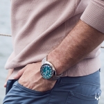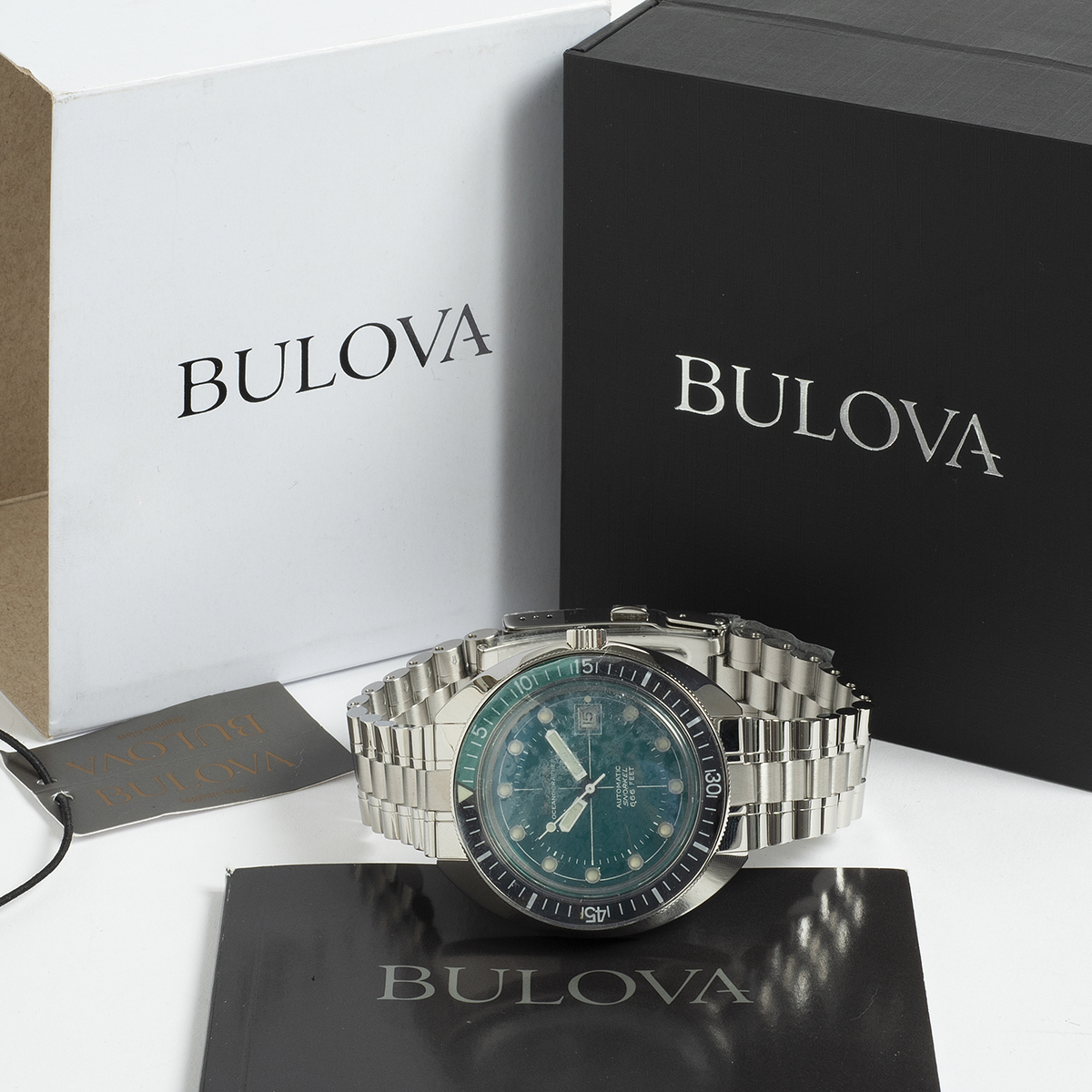 Silver-tone stainless steel case with a silver-tone stainless steel bracelet. Silver-tone stainless steel with a white ceramic top ring bezel. Mother of pearl dial with luminous silver-tone hands and alternating diamond and index hour markers. Minute markers around the outer rim. Dial Type: Analog. Luminescent hands. Date display at the 3 o'clock position. Quartz movement. Scratch resistant mineral crystal. Pull / push crown. Solid case back. Round case shape. Case size: 34 mm. Band width: 17 mm. Fold over with push button release clasp. Water resistant at 100 meters / 330 feet. Functions: date, hour, minute, second. Sport watch style. Watch label: Japan Movt. Bulova Marine Star Mother of Pearl Dial Ladies Watch 96P201.