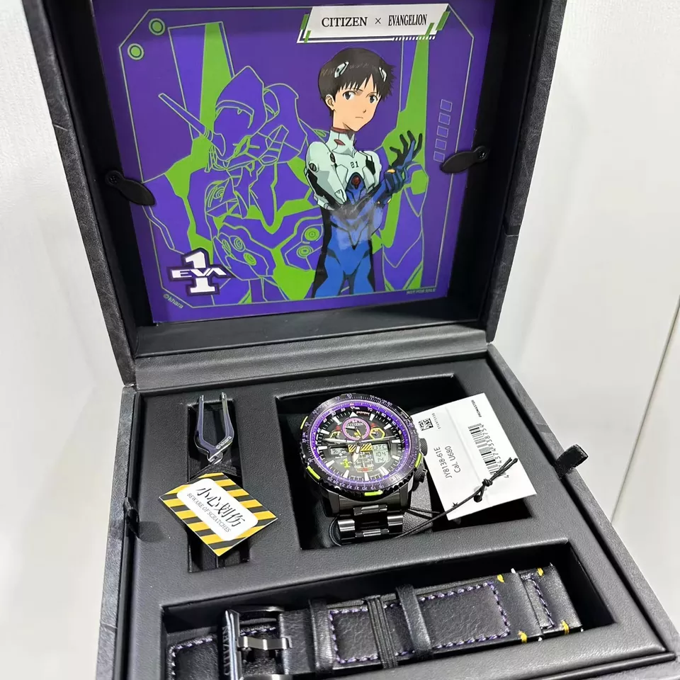 The Citizen X Evangelion EVA-01 Eco-Drive Radio-Controlled Limited Edition, JY8138-61E is a unique and high-performance timepiece designed. It features a sleek black dial and a durable stainless steel bracelet, combining style and advanced functionality.