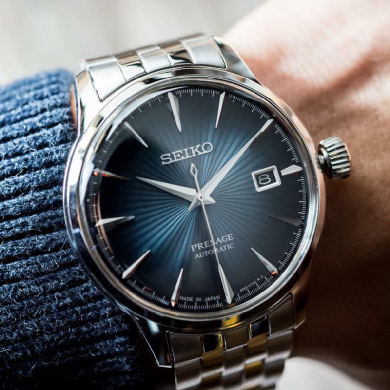 The Seiko Presage Cocktail SRPB41J1 “Blue Moon” features a stunning blue sunburst dial and a stainless steel bracelet, making it perfect for both formal and casual occasions.