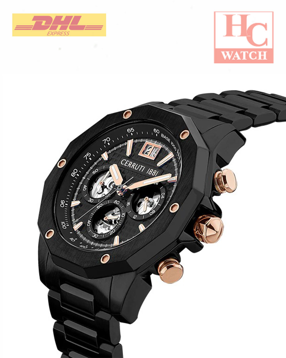Cerruti 1881 is a Parisian fashion house founded by Italian stylist and fashion producer Nino Cerruti, the SportyDad, Brand offers a range of elegant timepieces and accessories that are made of high quality materials and are aimed to express refinement, modernity and luxury. 45.5mm IP black stainless steel case and bezel with IP rose gold screws Black color dial with IP rose gold hands and hour markers 22mm IP black stainless steel bracelet Japanese precious quartz movement 3 hands with date Mineral glass 5 ATM water resistant 2 years international warranty