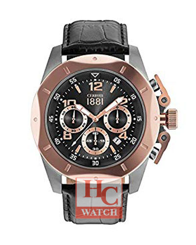 Material & Measurements Model:CRA182SUR61BK Manufacturer:Cerruti Series:1881 Type:Men's watch, Dress / Sport Diameter:Ø 50.00 mm Case:Grey steel Back case rear:Solid Bracelet:Black leather Dial:Black with arabic numerals and index markings, luminescent hands Buckle:Tang type buckle made of steel Glass:Mineral, shatter-resistant Bezel:Rose gold colored, brushed/polished Movement & Functions Movement type:Quartz (battery powered) Seconds hand:Ticking Date:Date Water protection:5 ATM Functions:- Separate seconds dial - Chronograph Other:Screw down crown