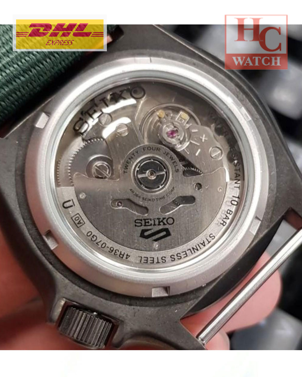 Basic Info : Reference number :SRPD77K1 Brand :Seiko Model :5 Sports Movement :Automatic Case material :Steel ConditionNew :(Brand new, without any signs of wear) Scope of delivery :Original box Gender :Men's watch/Unisex Caliber : Movement :Automatic Movement/Caliber :4R36 Number of jewels :24 Case : Case material :Steel Case diameter :42.5 x 40 mm Thickness :13.4 mm Water resistance :10 ATM Dial numerals :No numerals Functions :Date Other specifications : Screw case back See-through case back Unidirectional rotating bezel 24 jewels Day/Date display Stop second hand function