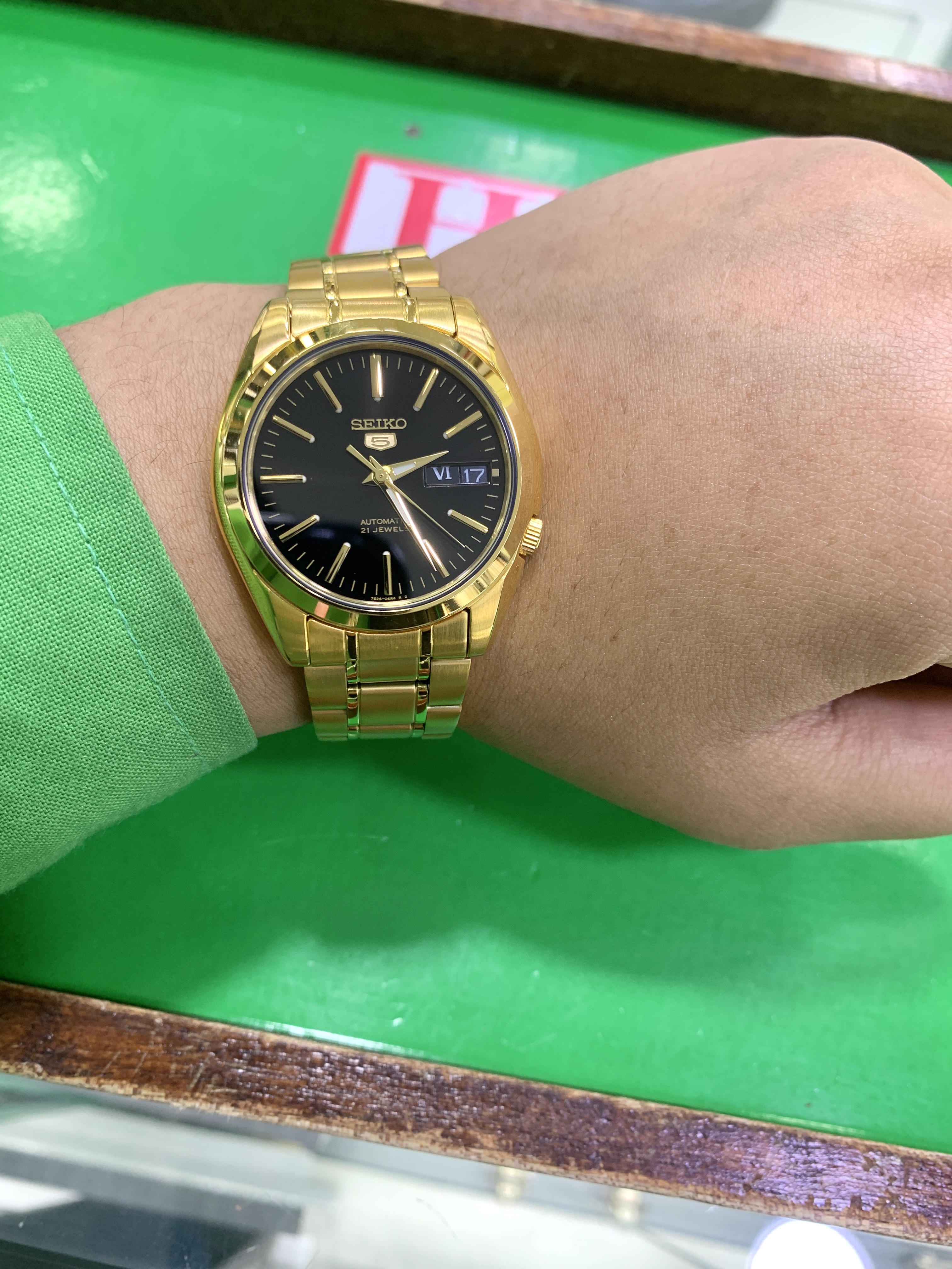 SEIKO 5 SNKL50K1 Men Automatic Gold Tone Stainless Steel Watch Movement: Automatic (Caliber 7S26) Dial: Black with luminous gold-tone hands and index hour markers Case Material: Gold-tone stainless steel Case Dimensions: 38 mm diameter Thickness: 11 mm Crystal: Hardlex Band: Gold-tone stainless steel bracelet Closure: Deployment clasp Water Resistant: 30 meters (3 ATM) Power Reserve: Approximately 41 hours Accuracy: +45/-35 seconds per day Weight: Approximately 130 grams Additional Features: Day and date display at the 3 o’clock position Luminous hands and markers Transparent case back Warranty: 3-year International warranty [Important Notes] **FREE Shipping & Insurance: We ship via FedEx or DHL Express with full insurance coverage. **Import Taxes: Not included in the price. Buyers are responsible for any taxes and duties. Kindly check with your local customs office for details. **Shipping Times: Processing time within 1-3 business days. Delivery typically takes 3-10 days depending on the shipping company and customs regulations. **Customs Clearance: Kindly stay updated with your local customs to ensure smooth delivery.
